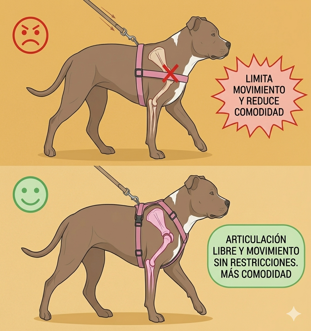Entre los contras de este tipo de arnés, hay varias cosas a mencionar. Jamás los he visto bien ajustados en ningún perro. Ni la cinta trasera, que debería dejar el juego del hombro libre, ni la del pecho, que siempre va caída, imposibilitando el buen movimiento y además provocando un efecto “estrangulador” en las patas que provoca cierta deformidad cuando ves caminar al perro.